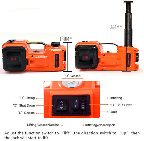 - Rated Capacity-5.0T(11023lb) jack capacity. Work with 12V vehicle power outlet, low-pressure rod, set for the sports car. The double motor driver inside, work independently.
